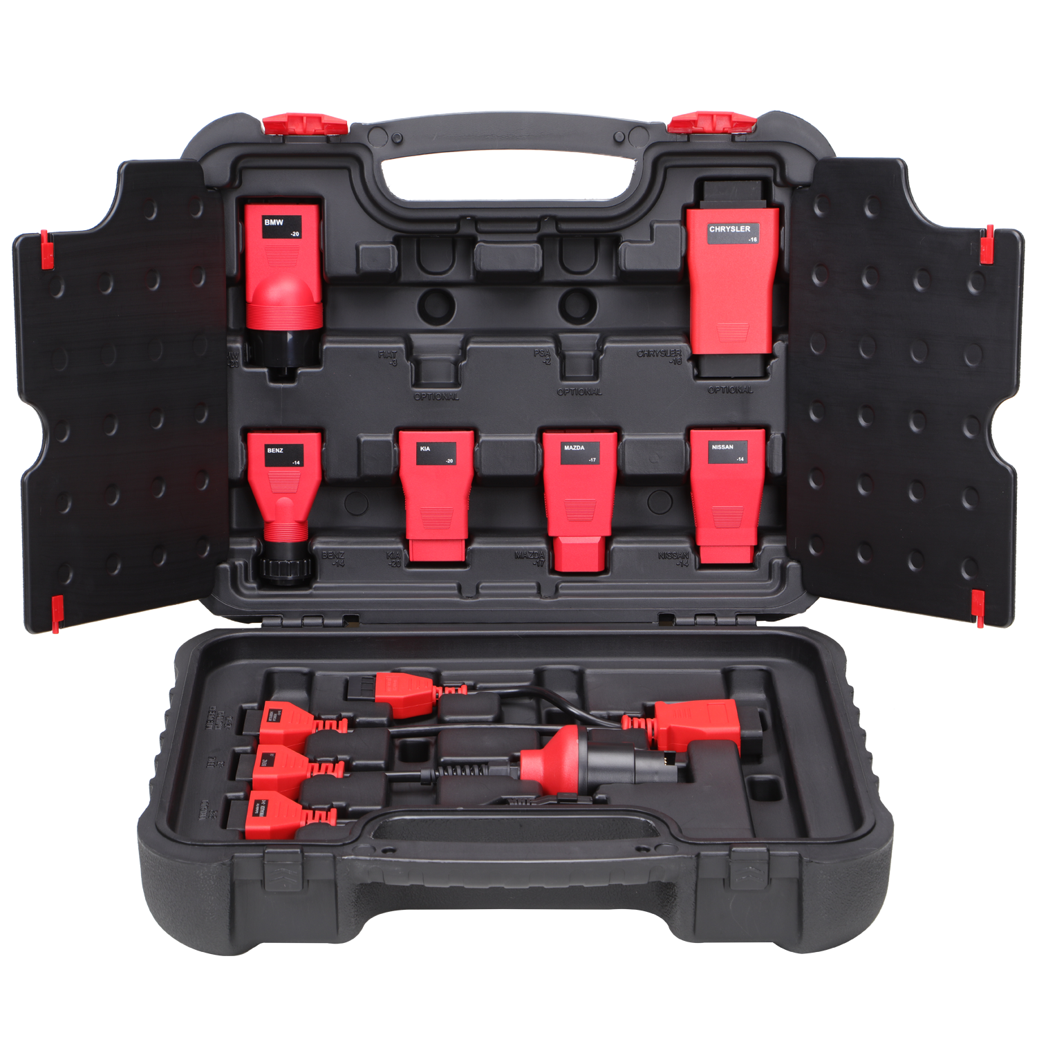 WARRANTY: The MSOBD2KIT, compatible with the MSUltra, MS919 and MS909, includes OE-compliant adapters for specific vehicles produced between 1996 and 2002 without the standard OBD2 pin configuration. Connectors Include Nissan-14, Mitsubishi/Hyundai 12+16, Kia-20, BMW-20, Benz-38, VW/Audi-2+2, Mazda-17, Chrysler-16 and Benz-14, within a blow-molded carrying case.